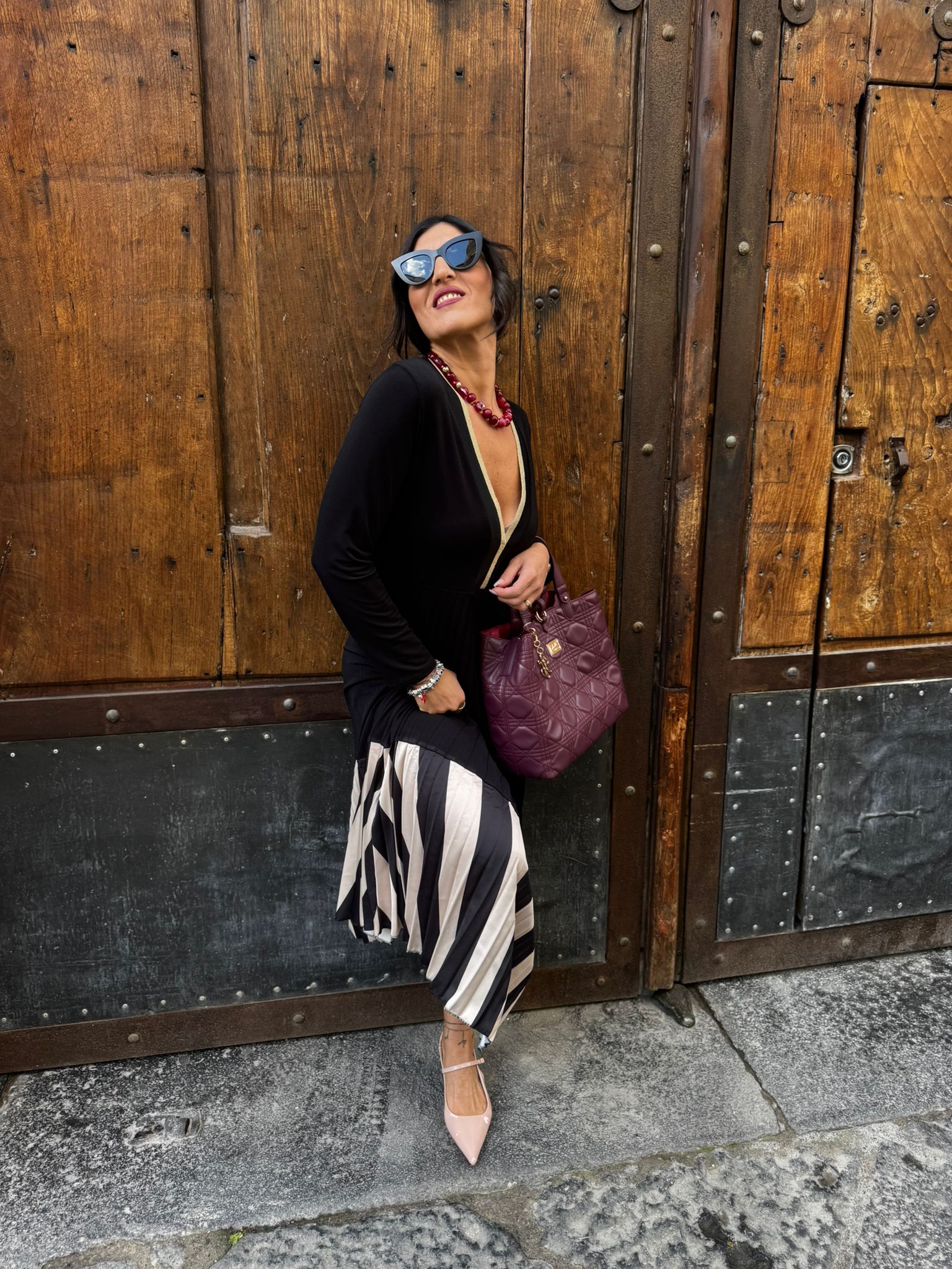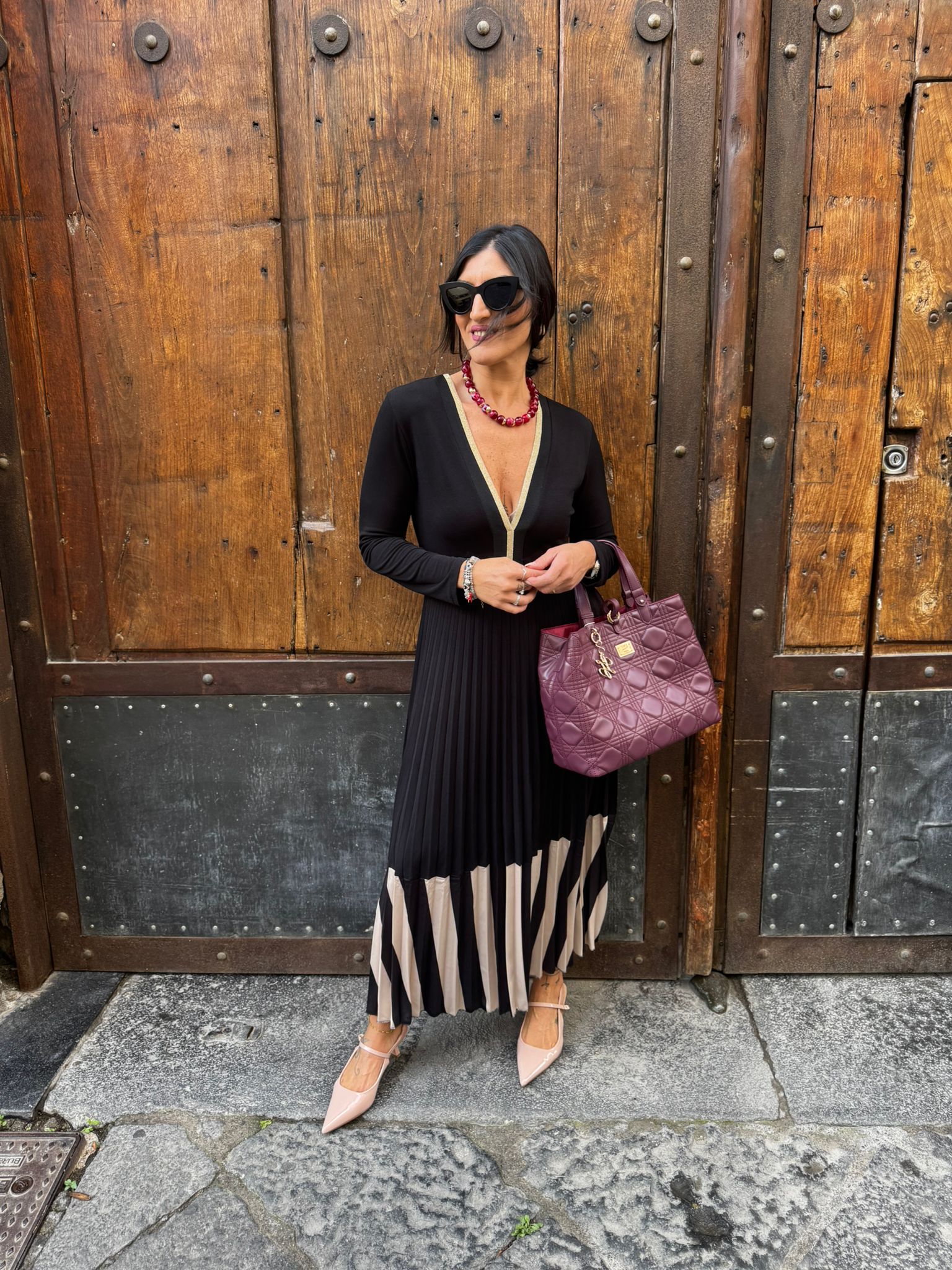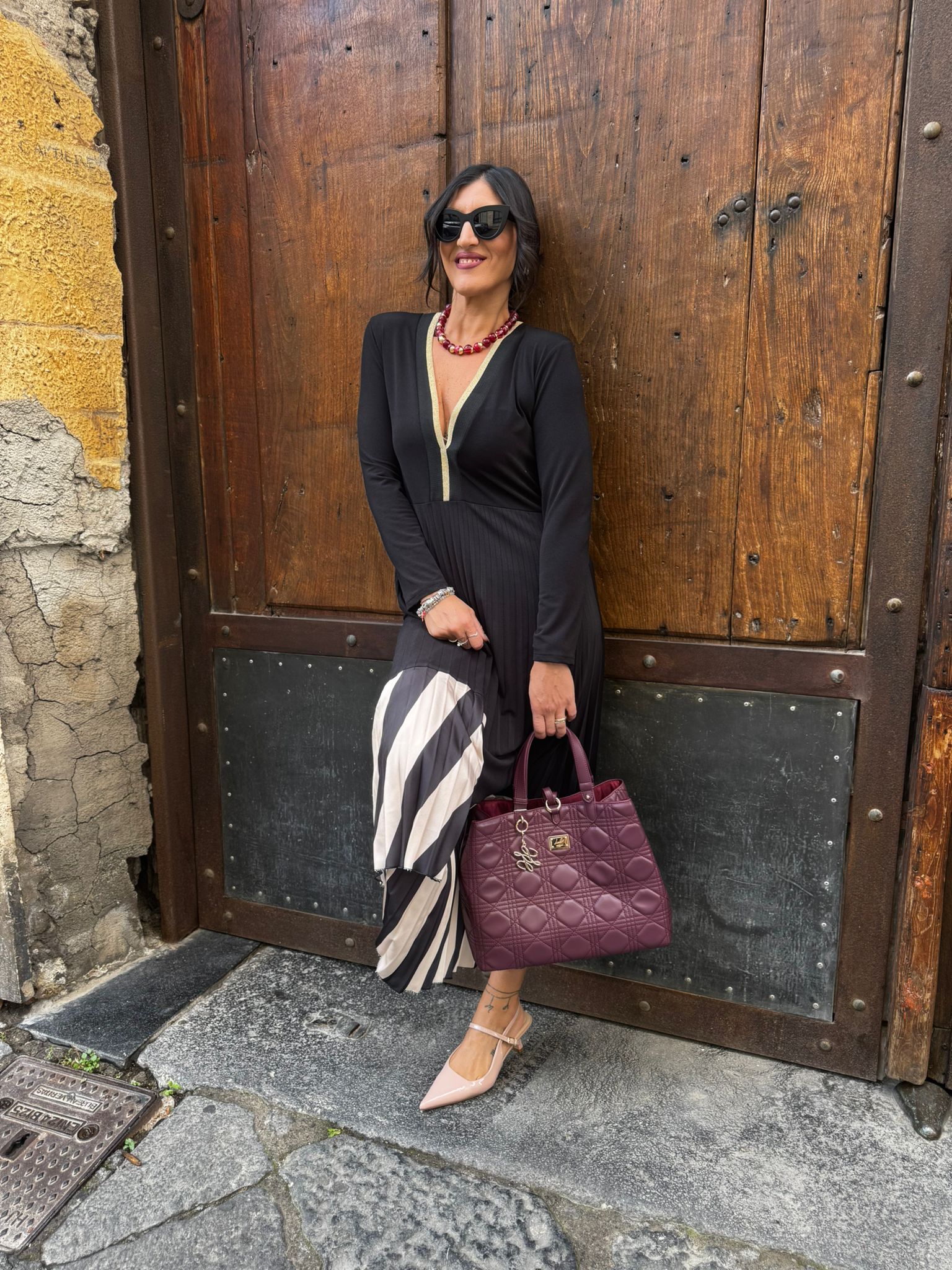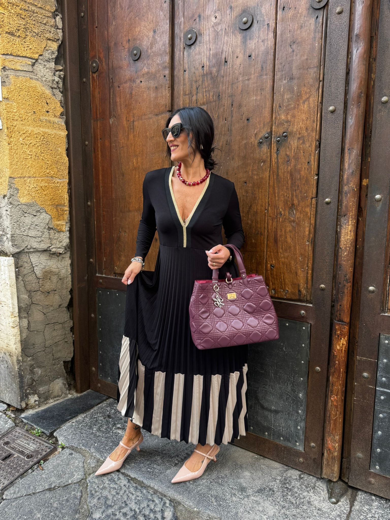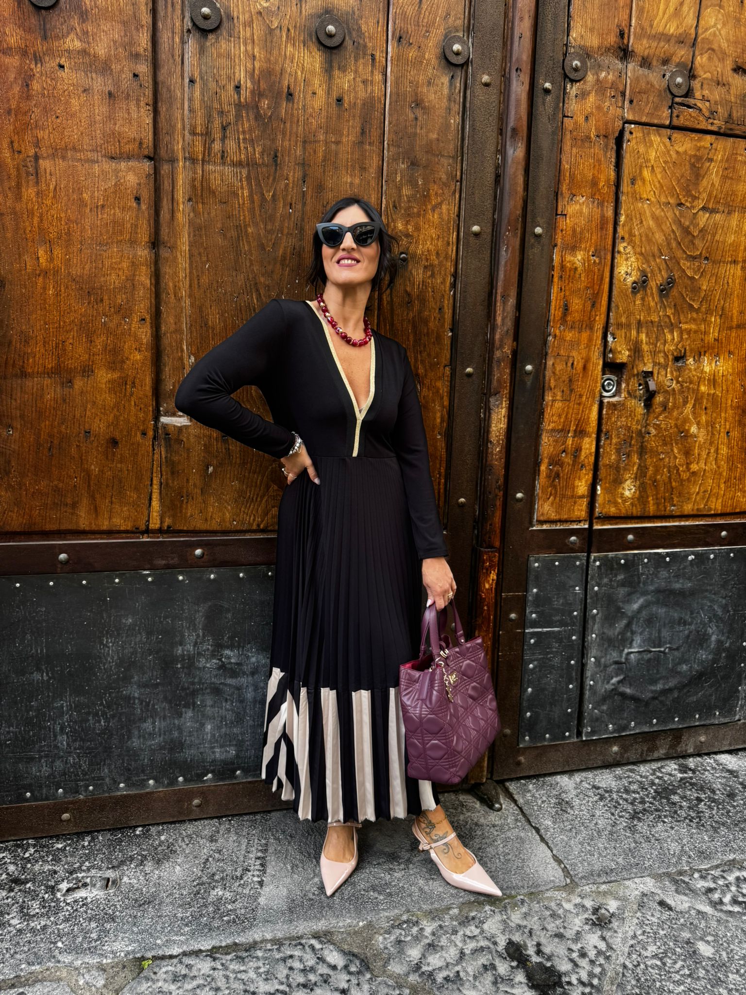 Abito con scollo V in lurex con gonna plissè bicolore Lizalù 4577