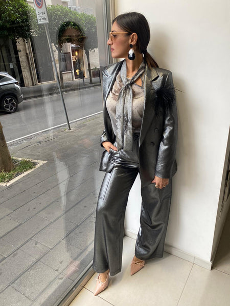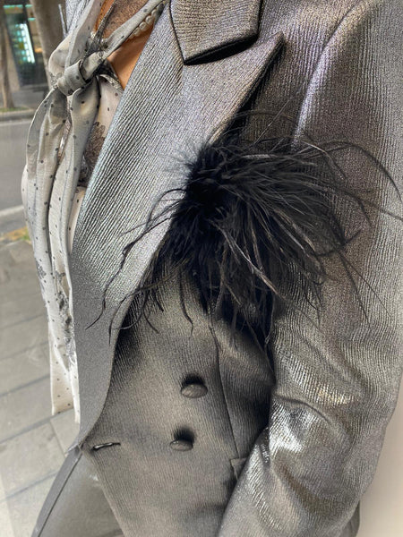 Giacca doppiopetto con pattine tessuto metallizzato con spilla piume Akè 5509