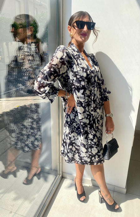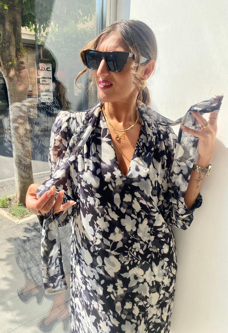 Abito manica lunga in chiffon a fantasia con cravattino Lizalù 7430